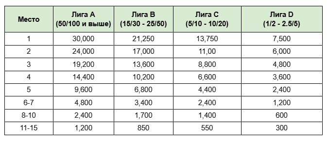 Лидерборды разбиты на 4 лиги по лимитам, за каждый рубль уплаченного рейка в соответствующую таблицу начисляется 1 балл. Столы быстрого покера не учитываются.
