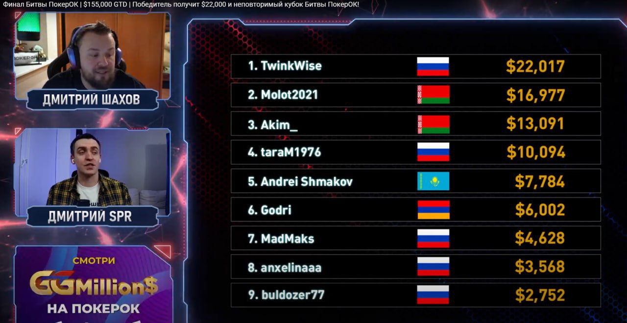 Триумф микролимитчиков и даже игроков фрироллов! Стрим финального дня с комментариями двух Дмитриев — Шахова и SPR — можно посмотреть на твиче. Участвуйте в турнирах «Битвы ПокерОК» в декабре, чтобы тоже получить шанс отобраться в финал. Бай-ины — от $5 до $50. Финал стартует в первое воскресенье каждого месяца. Следующий пройдет 5 и 6 января, гарантия $100,000.