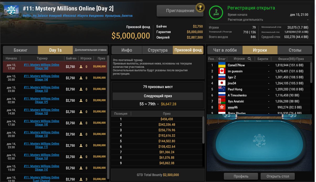 Участие в турнире наверняка будет особенно выгодным — за двое суток до старта оверлей составляет почти $3 млн! Прямой бай-ин в турнир стоит $2,750, стейджи идут ежедневно, последний начнется 15 декабря в 18:30. Второй день турнира стартует в воскресенье, 21:00.