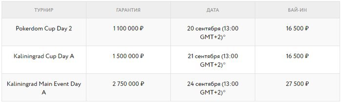 Kaliningrad Cup: бай-ин 16,500 рублей, гарантия 1,500,000 рублей. Старт 21 сентября. Сателлиты за 0, 200 и 2,000 рублей.