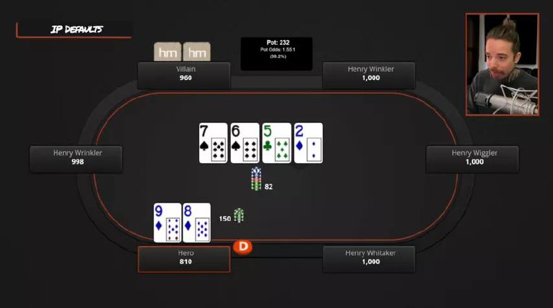 👌 Пример 1. Зарейзили 9♦️8♦️ с баттона, игрок на ББ защитился, вышел флоп 7♠️6♠️5♣️. Сколько поставить, чтобы оппонент рейзил сильные руки и коллировал со слабыми? Если выбрать бет в районе 50% пота, он явно будет на такой дровяной доске рейзить стрит, сет, две пары, правильно? Значит, годный сайзинг.