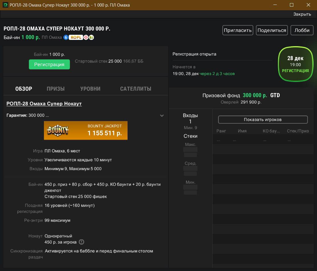 💪 Суббота (28.12), 19:00 и 20:00. Сразу два турнира с гарантией 1 млн: мультибаунти за 2,500 и «Миллионник» за 10,000.