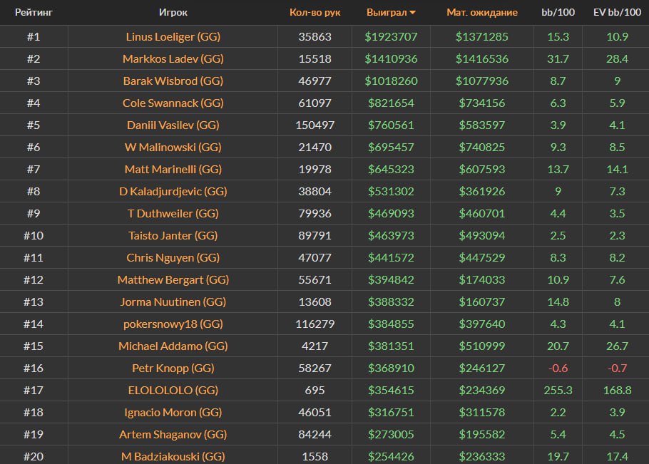 😎 Кто еще из наших регов хорошо выступил? Задорный хайроллер Даниил Васильев сыграл фантастические 150 тысяч раздач на GG (гораздо больше, чем кто угодно из топа) и нажил $821,000, это 4 ББ на 100. Почти столько же ($695k) заработал Виктор Малиновский, но справился куда быстрее, всего за 21 тысячу раздач (9.3 ББ на 100). На 19-м месте Артем Шаганов (oSpiel) с профитом $273k, на 20-м — Никита Бодяковский, заработавший $254k всего за полторы тысячи раздач.