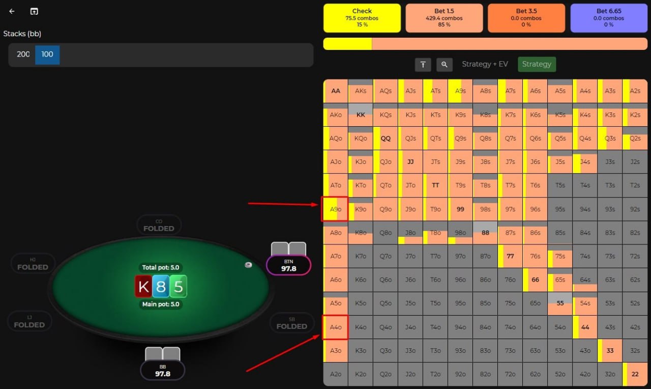 🤔 Как именно? Вы открылись с баттона, игрок на ББ защитился, флоп K♥️8♦️5♣️. Сравним нашу стратегию с двумя руками: A♣️9♦️ и A♣️4♦️. Обе не попали в борд, но у А9 шоудаун-велью больше: она чаще победит на вскрытии, а значит, EV чека с ней выше. А вот ставить с ней смысла мало: оппонент выбросит все Ах слабее и руки с 9х, которые вы доминируете (вроде Q9 и J9). Ставка же с А4 может выбить Ах старше, а шоудаун-велью у нее меньше, поэтому солвер часто поставит с А4, но чекнет с А9 (смотрите скриншот внизу).