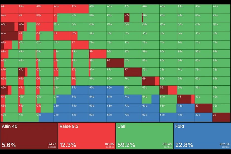 🙅♂️ Солвер никогда не сыграет тут коллом. Посмотрите на скриншот внизу: все пары 88 и ниже машина просто будет пушить со стеком 40 ББ. Никакого сет-майнинга! Кто-то скажет, что если баттон заколлирует наш пуш, то дела у четверок будут совсем плохи. Но это не так: на месте баттона солвер коллирует со 155 комбинациями, из которых только 60 — пары старше. Против остальных 95 вы сыграете коинфлип.