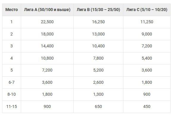 - Лига B: 15₽/30₽ - 25₽/50₽