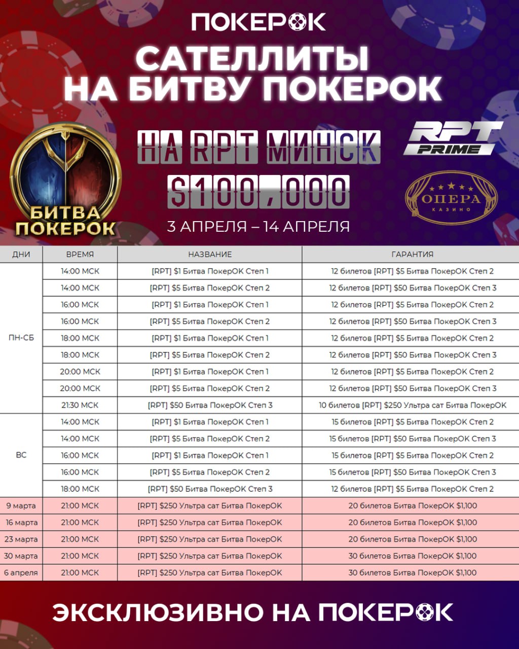 Каждое воскресенье в 21:00 будут идти ультра-сателлиты, где разыгрывается по 20 билетов в целевой турнир. А подержать карты в румках можно будет в первый входной день, 1A, уже 8 апреля, 13:00 МСК.