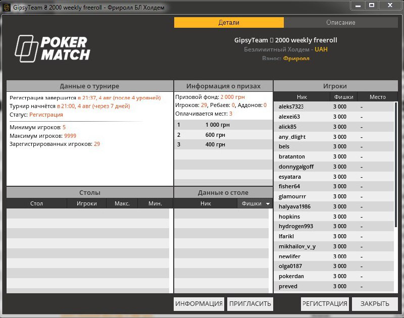 Каждый вторник в 21:00 по Москве на PokerMatch стартует закрытый фриролл только для игроков GipsyTeam — хорошая возможность поднять банкролл без вложения денег. С этой недели его призовой фонд удваивается: теперь в нем разыгрывают 2,000 гривен.