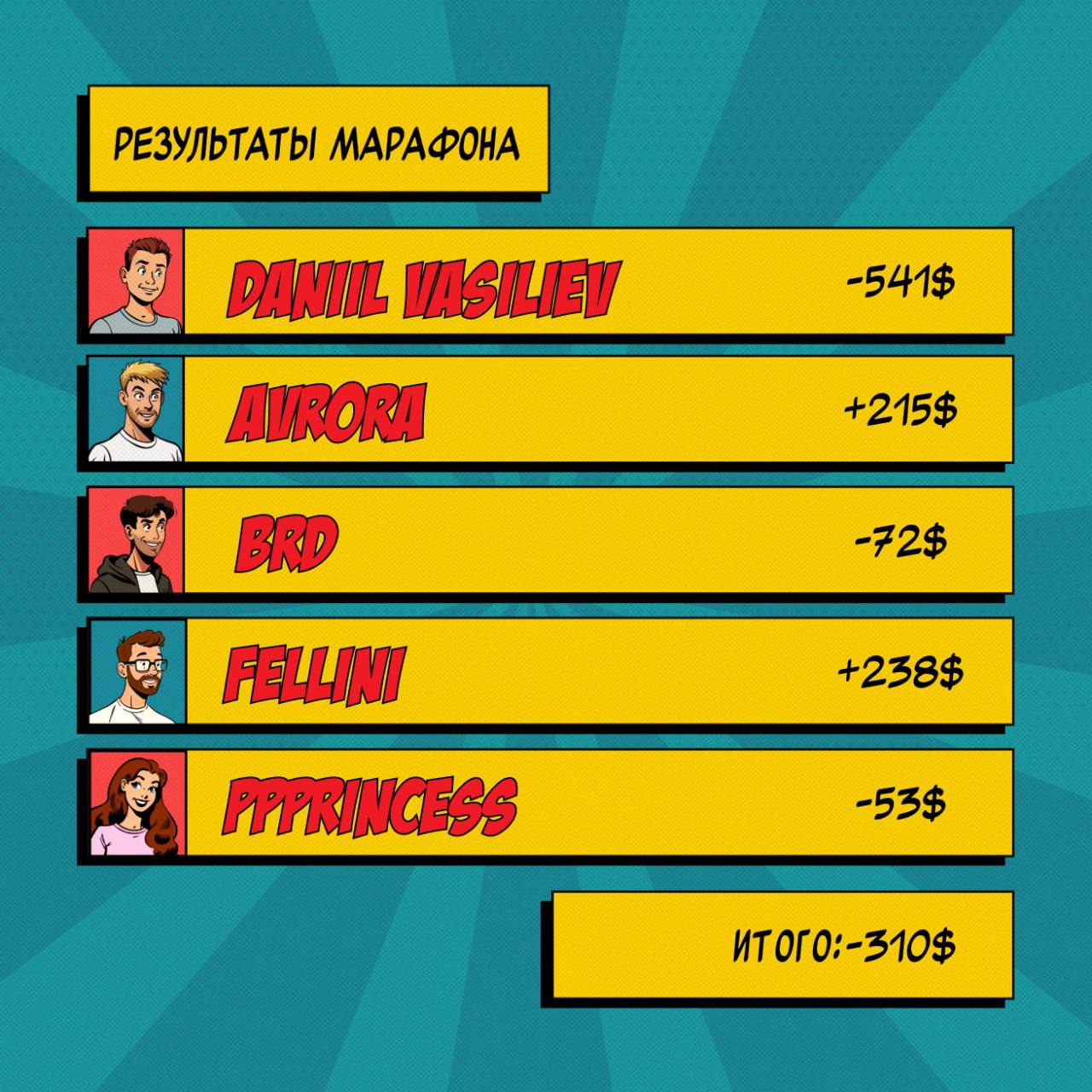 🏠 Реги NL10 победили хайроллеров. Стримхата покеристов закончилась поражением: четверо стримеров и трое гостей закончили неделю безостановочных трансляций в -$310 (см картинку, также в минус закончили Николай Dyrdom1 (-$58) и Александр Alexz1z (-$39). По итогам челленджа в плюсе остались двое: Аврора выиграл $215, Феллини — $238, а Даниил Васильев обогатил регов NL10-20 на $541. Но шоу вышло отличное, ждем продолжение!