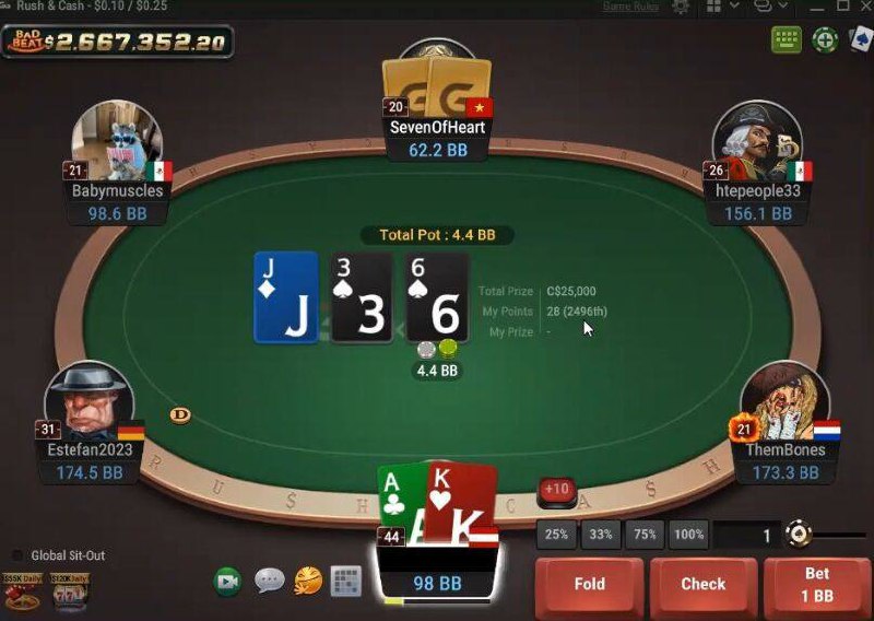 👉 Холдем. Несколько столов 6-макс от NL25 до NL100. Один стол Squid Game NL10 8-макс, но полупустой. Пара столов хедз-апа NL100. Быстрый покер только на NL25 (30-40 подключений). В раше есть бомбпоты и ежедневный лидерборд на $250.