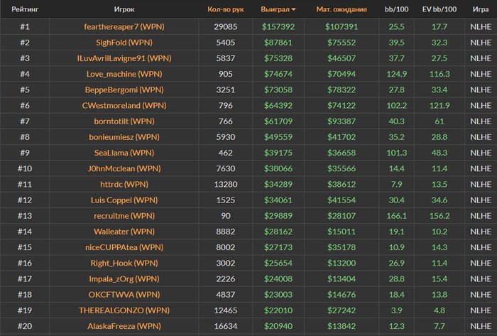 😎 В топе WPN неожиданный гость. Лучше всех в руме выступил fearthereaper7 — анонимный топ-рег, играющий под флагом Канады. В марте он и гриндил больше всех, и выиграл тоже: аж $157k за 29 тысяч раздач. Играет высокие лимиты Рипер уже около 5 лет, в плюсе на семизнак, и никто не знает, кто он такой. Зато на 7-й строчке игрок, чье имя знают все: Линус всего за 766 раздач заработал $62k (40 ББ на 100).