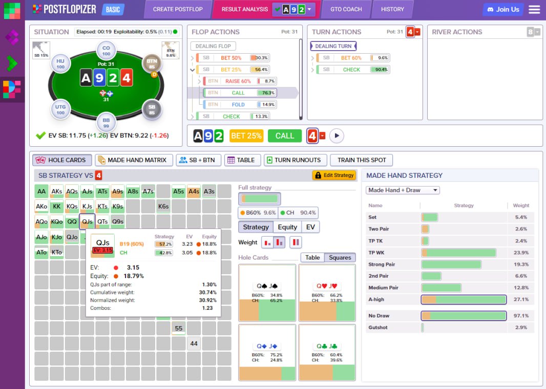 На скриншоте ниже можно увидеть, что Нияз как всегда прав — судя по расчету из Postflopizer, машина действительно активно баррелит с руками вроде QJs, даже без бекдора. И пока ваши оппоненты не научатся так же, не платите им лишнего! А если хотите тренироваться у Нияза и других опытных тренеров, подавайте заявку в GreenLine. Там есть группы по холдему и омахе для игроков любых лимитов, в том числе и для новичков.