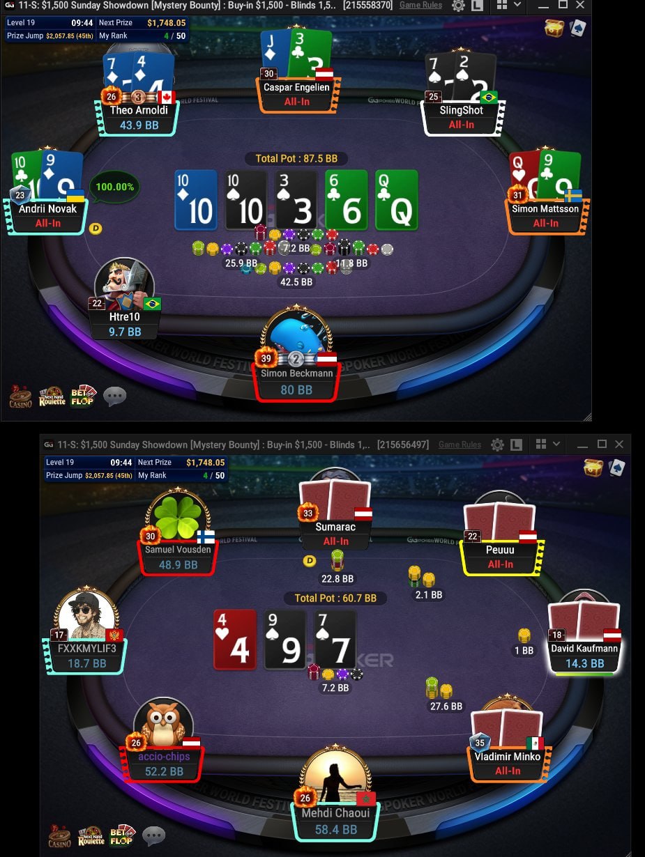 Стример Beriuzy показал в твиттере пару скриншотов, идеально иллюстрирующих суть Mystery Bounty. В топ-50 турнира Sunday Showdown за $1,500 война за сундуки вылилась в массовые олл-ины на любых картах. «Прямо сейчас 16 человек из 50 в олл-ине, ЛОЛ. Мы правда будем делать вид, что это норм? Этот формат — идиотство, он должен был устранен» 🙅♂️