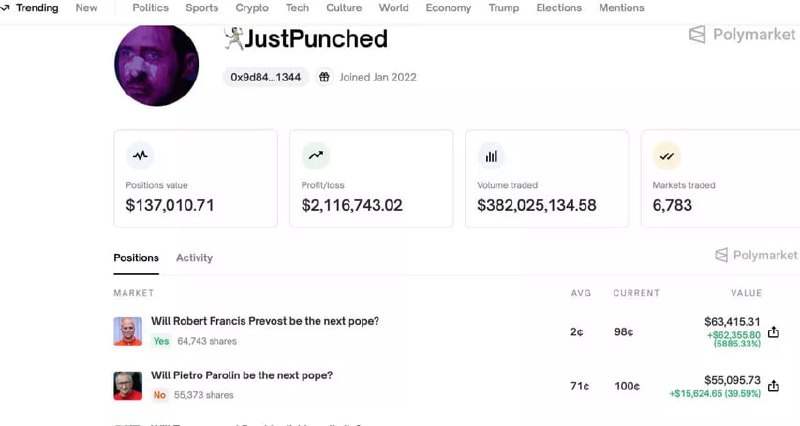 На Полимаркете (криптоплатформе для ставок на что угодно) есть пользователь JustPunched, заработавший с января 2022 года больше $2.2 млн. В твиттере он известен как Domer (под 14 тысяч подписчиков) — и на днях рассказал там, как выборы нового папы принесли ему $100,000. Мы перевели его историю для GipsyTeam — и это один из самых ярких материалов года 🔥
