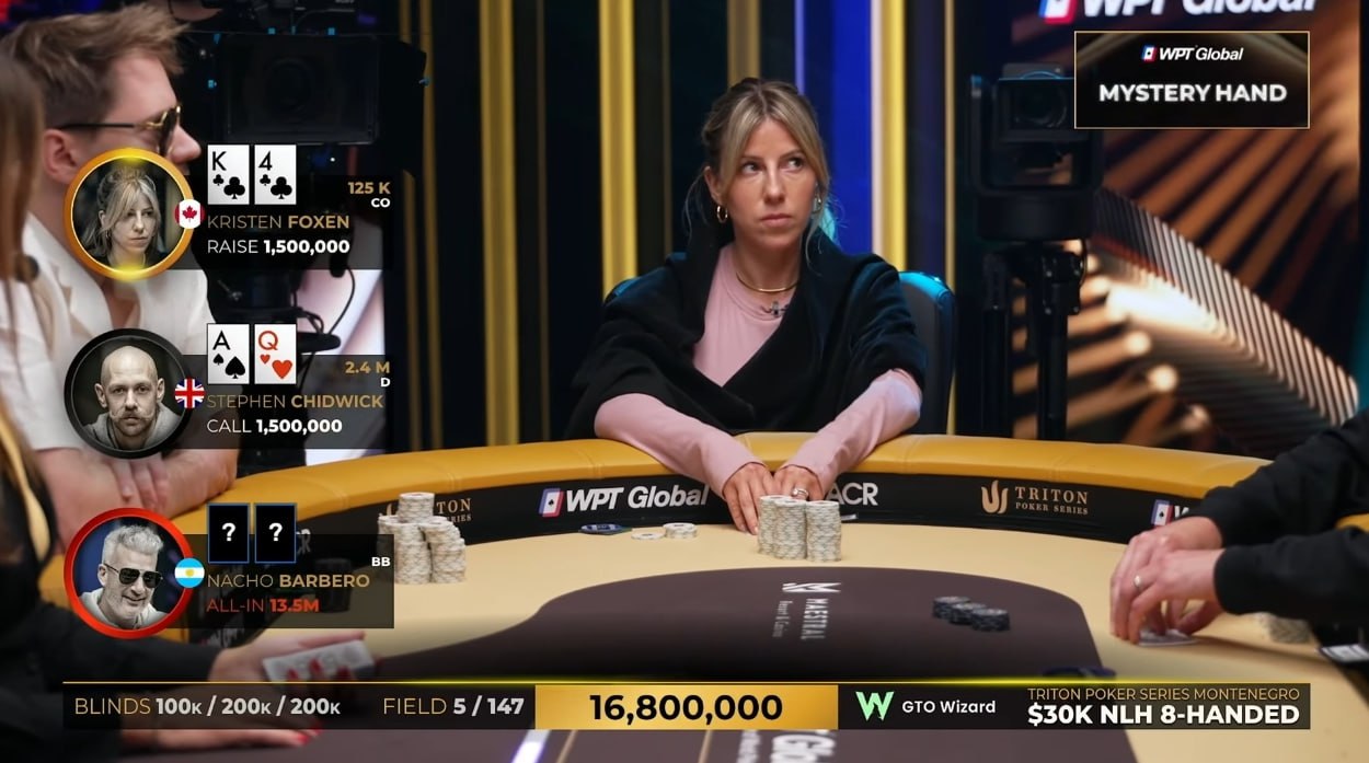 Самую обсуждаемую раздачу вечера сыграла Кристен Фоксен в 5-максе. На блайндах 100k/200k она со стеком 8 ББ поставила с катоффа «недопуш» 7 ББ (1.4 млн) с K♣️4♣️. Следом на баттоне Стивен Чидвик (стек 3.9 млн) поднял A♠️Q♥️ — и заколлировал. Ну а дальше, к ужасу обоих оппонентов, Начо Барберо (чиплидер, 13.5 млн) поставил олл-ин с ББ с A♦️Q♣️.