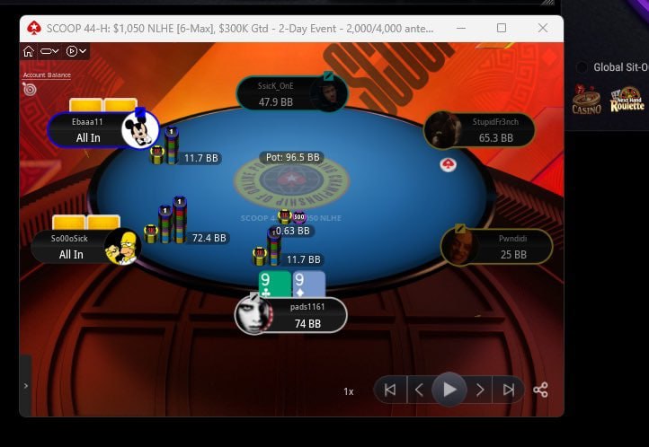 Падс на днях оказался в сложном споте в турнире SCOOP за $1,050. Когда оставалось 50% поля, Никита Кузнецов запушил 12 ББ с лоуджека, Падс заколлировал на SB с 99 (оставив за спиной еще 74 ББ) — и получил пуш 72.4 ББ от so00osick на большом блайнде (смотрите скриншот внизу). «С какой худшей парой вы бы тут выставлялись?», — обратился Патрик к подписчикам 🤔