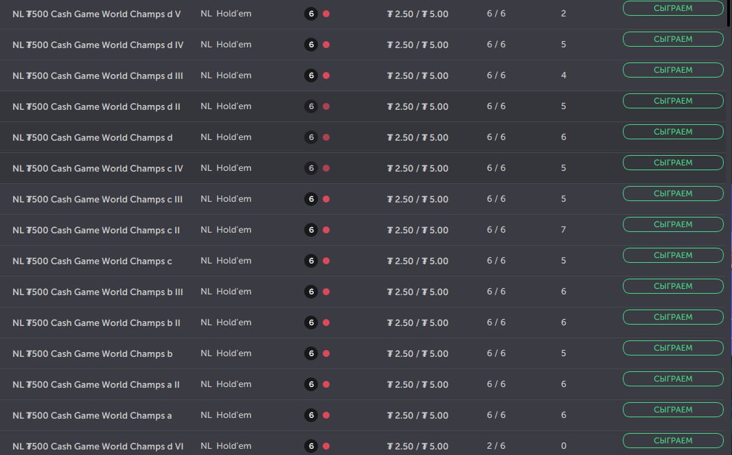 Теперь наступила пора выяснить лучшего игрока мидстейкс! Вчера стартовал аналогичный чемпионат на NL500. Играть будут за специальными 6-макс столами без рейка с минимальной закупкой 100бб, победитель раздачи автоматически показывает свою руку — не пропустим ни дикие блефы, ни жадное велью. Продлится чемпионат 4 недели, пятеро лучших (по EV, минимум 20k раздач) разделят $25,000, в том числе ролексы за $15k. Дополнительный бонус — пятеро топовых игроков недели получат по $1,000 на игру за особыми VIP-столами с амбассадорами рума 🚀