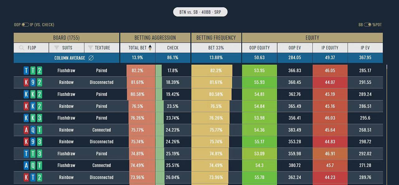 2️⃣ Лид после колла с SB. Их тоже не так много, но больше, чем с BB. Посмотрите на скриншоте внизу лучшие борды для лидов в стеках 40 ББ против баттона. На некоторых спаренных бордах (в первую очередь ККх и ТТх) у вас будет гораздо больше трипсов и фулл-хаусов.