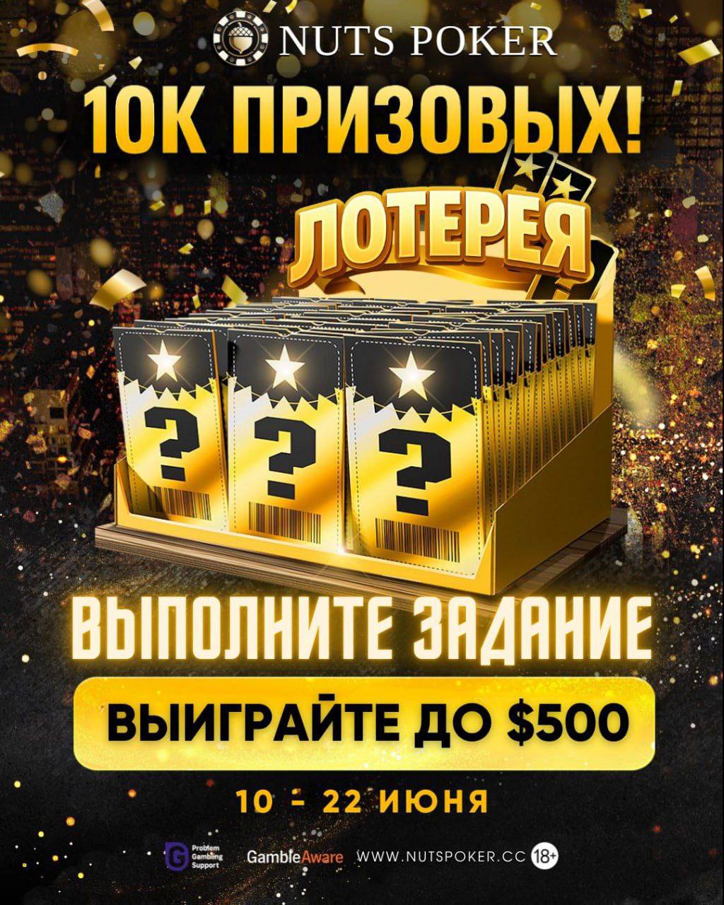 До 22 июня на Nuts Poker продлится акция Lucky Lottery, в которой игроки в кэш и быстрый покер могут выигрывать VIP-карты, билеты и до $500 на счет.