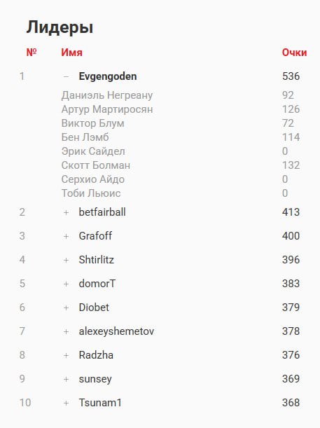 Таблицу лидеров по очкам можно посмотреть на сайте драфта.
