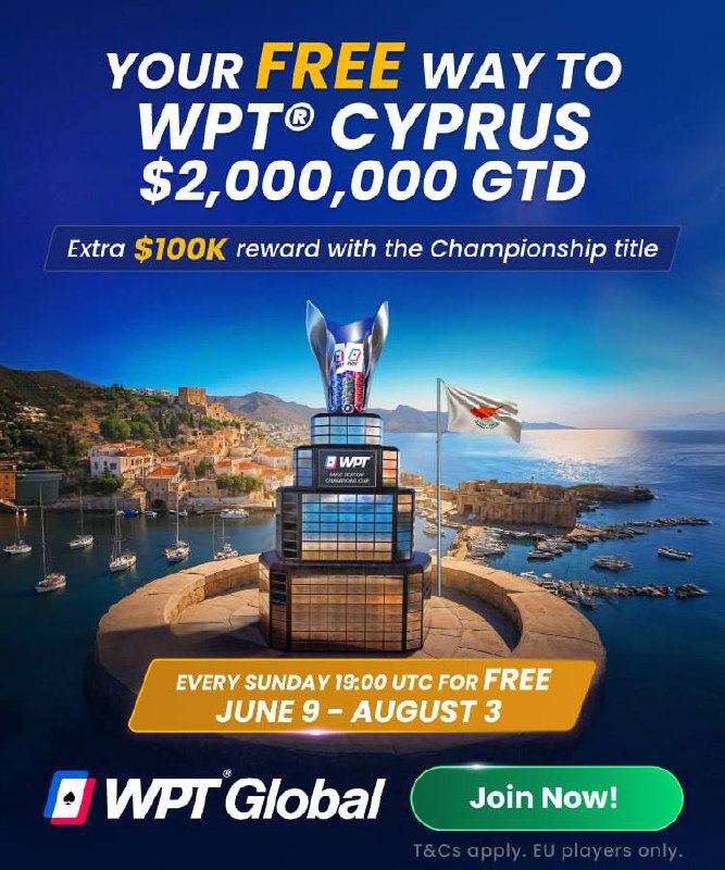 Победитель каждого фриролла получает билет за $3,500. Если он выиграет турнир на Кипре, WPT Global добавит бонус в $100,000.