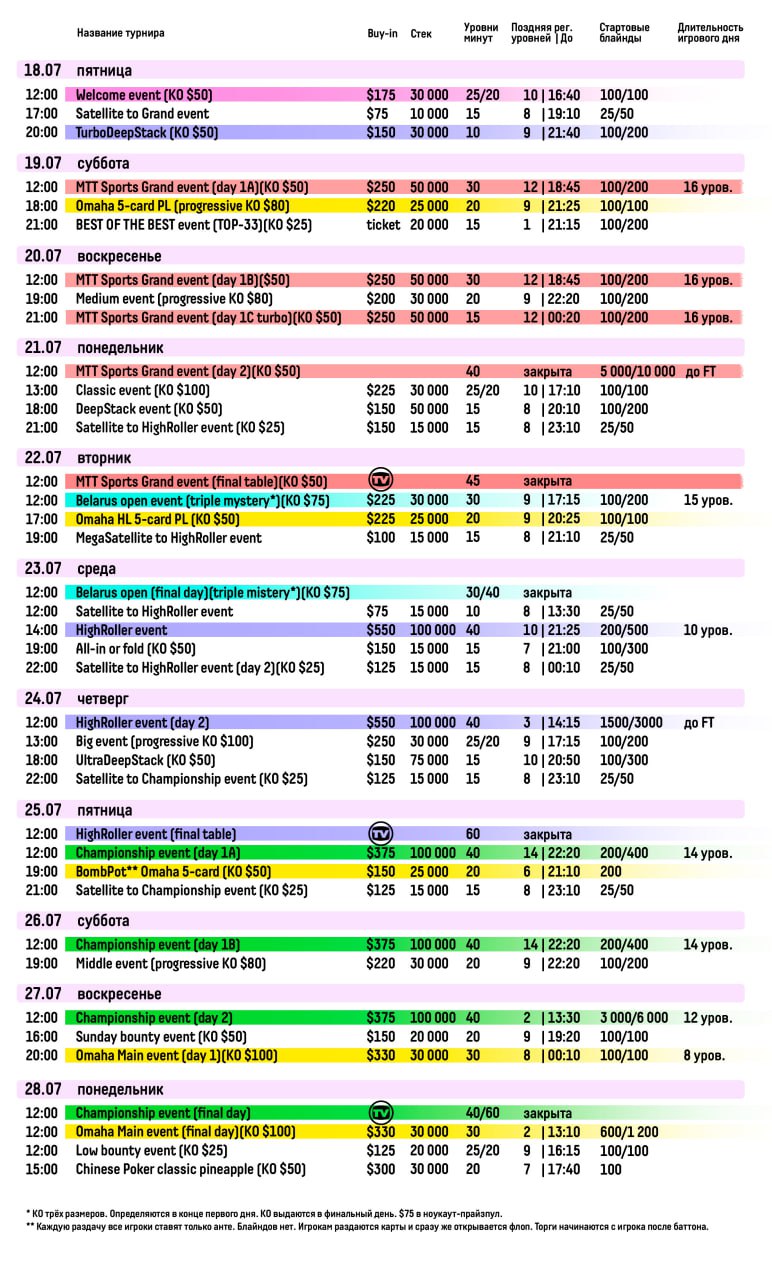 🎉 Турнирное расписание стало еще богаче. Увеличили стартовые стеки в побочных турнирах, вернули сателлит в Grand event, есть Mystery-турниры и турниры с бомб-потами.