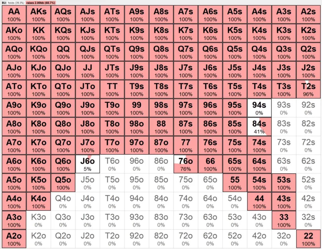 👉 А если мы на баттоне? Тут есть кое-что интересное, посмотрите на чарт внизу. Солвер открывает на 7% шире, чем в среде ChipEV, все сколько-то играбельные руки идут в рейз. Но всё-таки играбельные, совсем мусор машина рейзить не будет. Мало того, с баттона диапазон расширяется (относительно ChipEV) даже меньше, чем с UTG! Дело в том, что с баттона и так надо рейзить очень широко, особо расширяться уже некуда. И даже прямой баббл — не повод открывать совсем мусорные руки, если у ББ достаточно фишек для защиты.