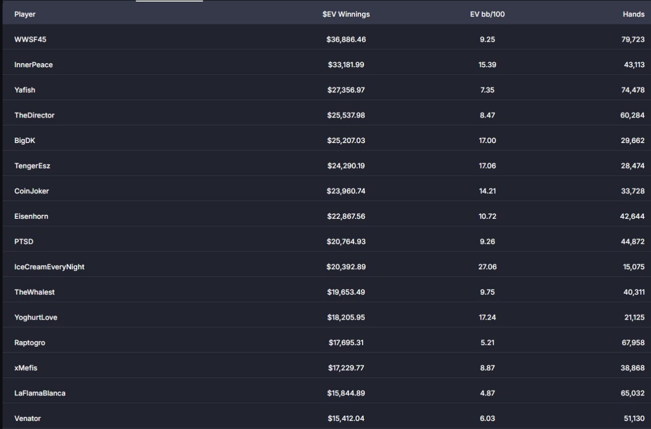 А вот игрок InnerPeace, наоборот, провел супер-выходные и почти выбился в лидеры, но не хватило примерно $3.5k профита. Зато винрейт он показал космический: 15.39 EV bb/100 за 43,113 раздач. На третьей строчке остановился игрок с самокритичным ником Yafish (вот его телеграм-канал): 74,478 раздач, 7.35 ББ на 100, профит $27,357. Чемпион получил Rolex за $15,000, еще четверо лидеров — призы от $4k до $1.5k 💰