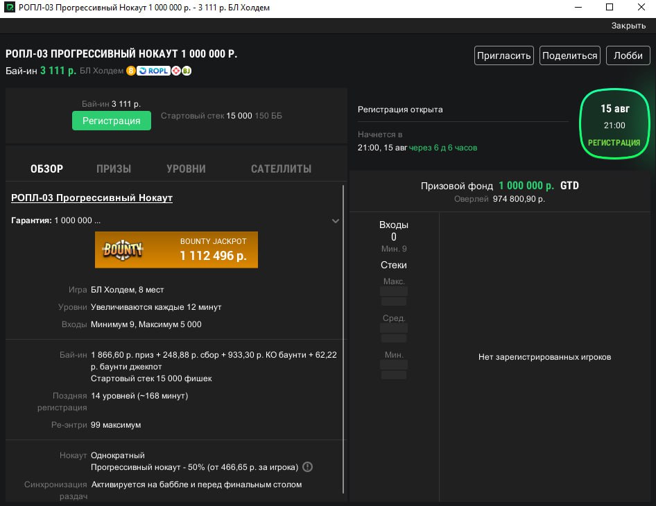 Во фриролле 4 стартовых флайта (18-21 августа), а 22 августа все прошедшие во второй день встретятся и будут играть до победителя. Регистрация будет открываться за 2 часа до старта, но можно получить место и заранее — как именно, описано на сайте PCM. Если раскрутиться с первого входа не получится, можно будет сделать реэнтри за 10,000 рублей 👌
