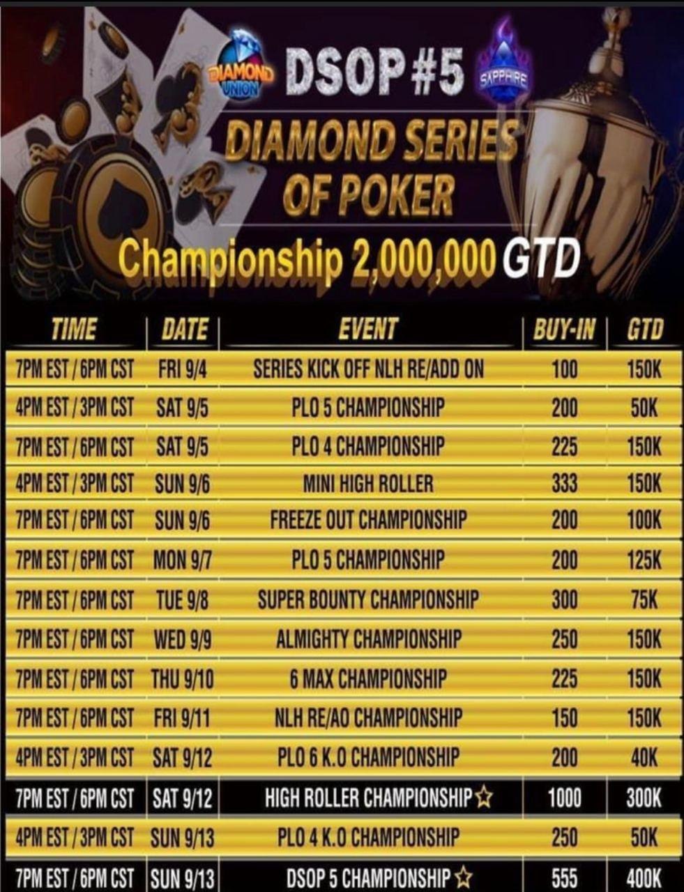 До 13 сентября в альянсах Diamond и PGA на PokerBros проходит Diamond Series of Poker. В расписании 14 турниров от $100 до $1,000, в том числе главный турнир за $555 с гарантией $400,000.