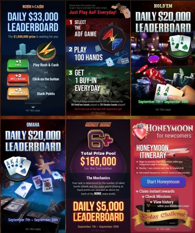 - $33,000 каждый день разыграют игроки в быстрый покер, Rush&Cash. Очки в лидерборд начисляются за действия в каждой раздаче. 1 очко за колл, 2 очка за бет/рейз, 3 покупку страховки. Во время кэшдропа добавляется еще 10.