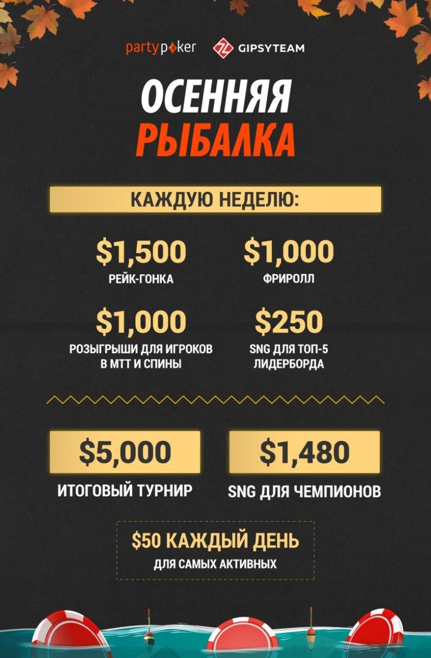 60% рейкбека на partypoker и вторая неделя Осенней рыбалки