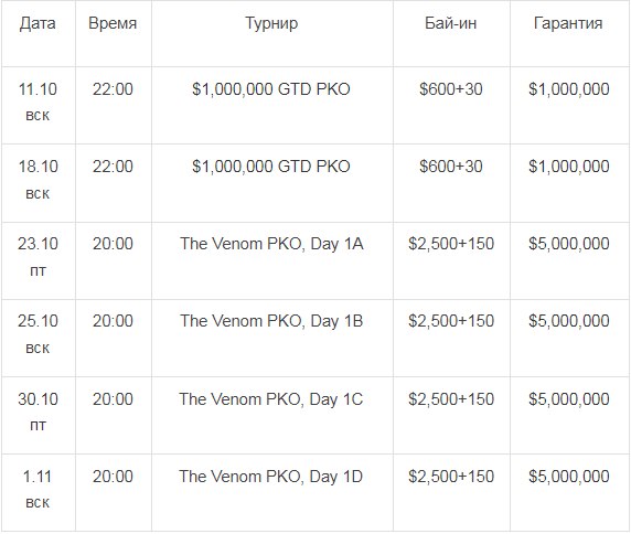 Несмотря на досрочное прекращение серии, самые крупные турниры пройдут по расписанию: два воскресных миллионника с бай-ином $630 и многодневный The Venom в нокаут-формате с гарантией $5,000,000.
