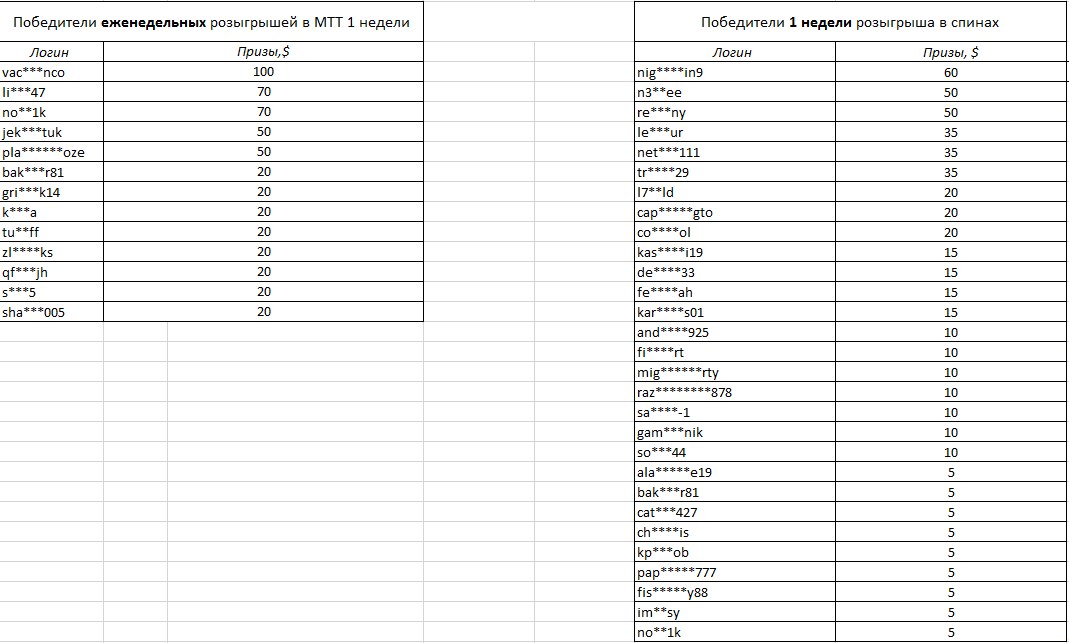 Небольшая поправка к итогам 1 недели Осенней рыбалки: результаты еженедельных розыгрышей в спинах и МТТ опубликованы с ошибкой. Настоящие результаты ниже: