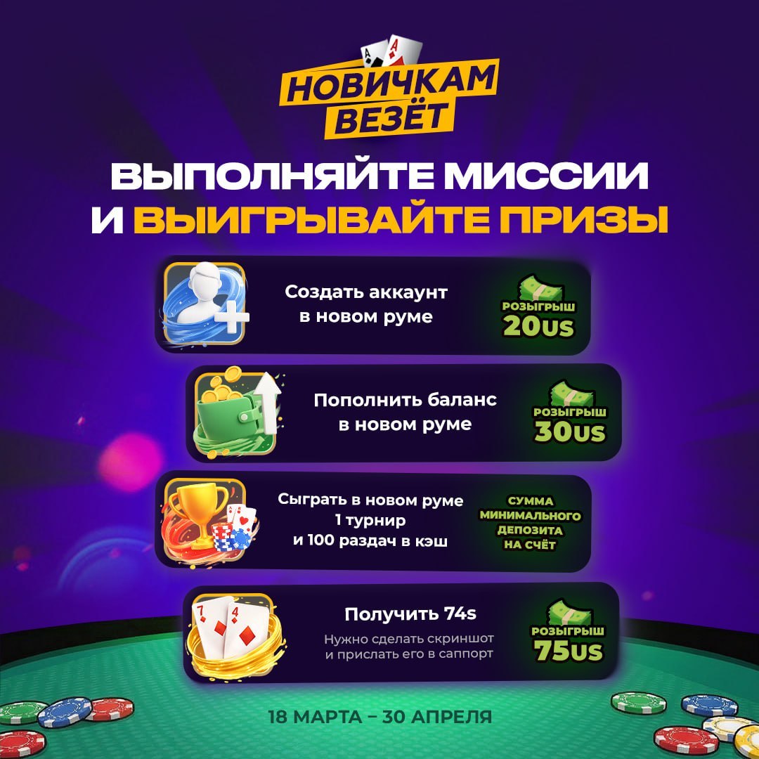 Как принять участие: добавим сумму минимального депозита всем, кто сыграет в новом руме один турнир и 100 раздач в кэше в холдем или омаху.