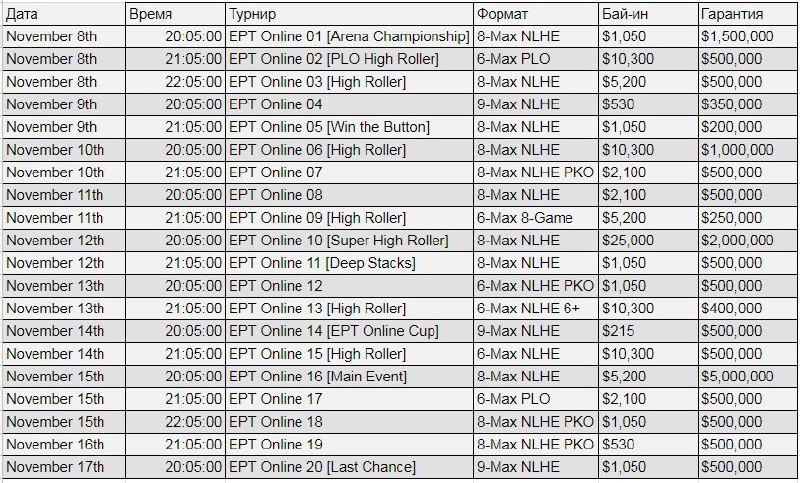 В основной серии будет 20 турниров с бай-инами от $215 до $25,000 по холдему, омахе, шортдеку и 8 играм, суммарно на $20,00,000 гарантии. В те же даты пройдет Mini EPT на $2,000,000: формат турниров не изменится, а вот бай-ины будут в 100 раз меньше.