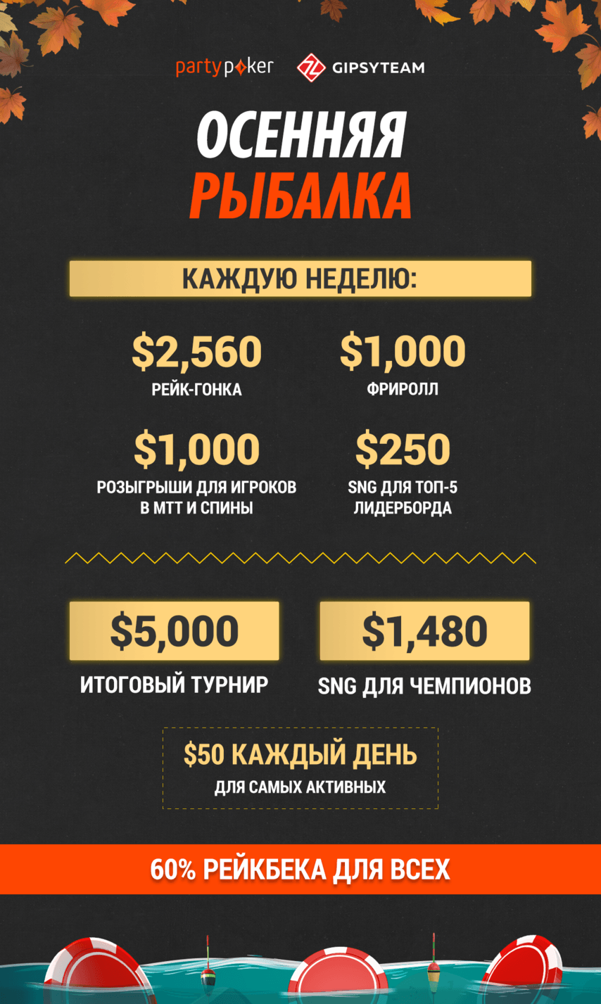 Подошел к концу еще один этап Осенней рыбалки! Этой осенью игра на partypoker для игроков GipsyTeam была максимально выгодной: стандартная программа лояльности приносила 60% рейкбека, участники гонки марафонов получали дополнительные денежные призы за интересные посты на форуме, а рейк-гонки Осенней рыбалки обогатили самых активных игроков еще на $10,000.