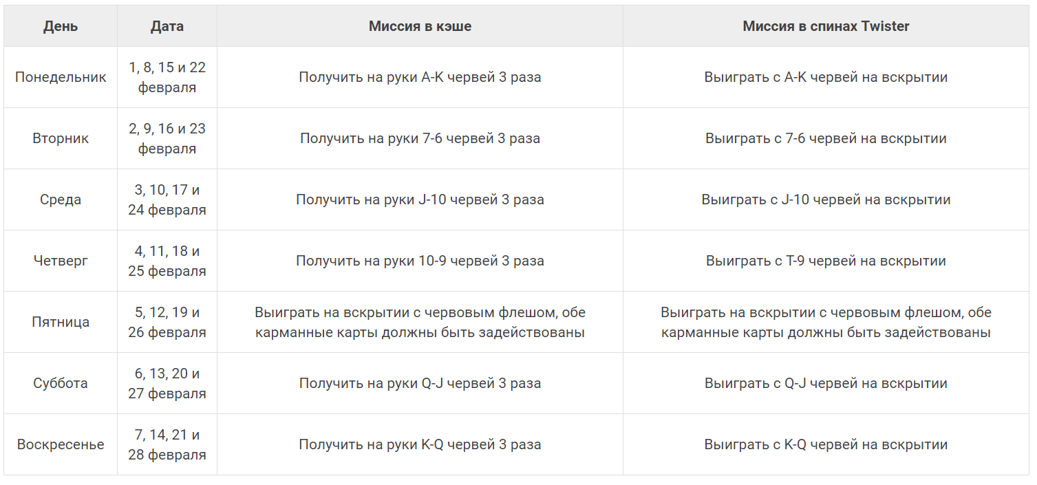 Главный турнир за $5,300 с гарантией $5,000,000 будет многодневным: внести бай-ин напрямую можно в воскресенье, 21 и 28 февраля в 22:05, но гораздо проще попытать удачу в традиционно оверлейных сателлитах от $0.01.