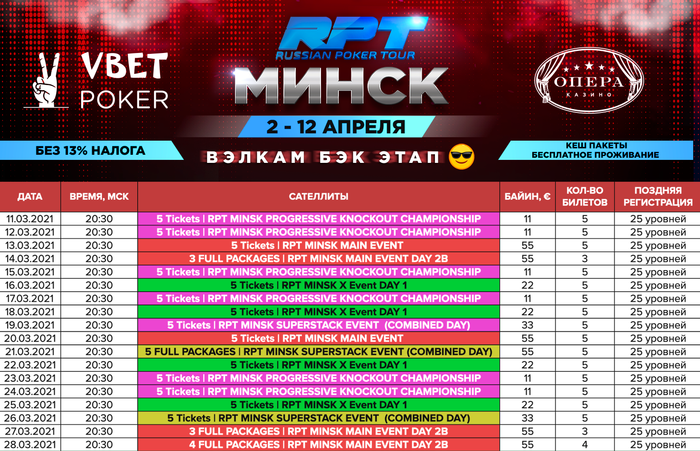 🇧🇾С 2 по 12 апреля в Минске пройдет новый этап Russian Poker Tour. Игроков ждет 16 турниров с бай-инами до $1,100 и ежедневной кэш-игрой, а сэкономить на турнирах можно будет в оверлейных сателлитах на VBET.