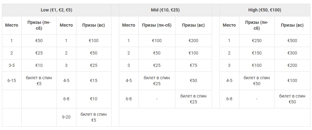 Правила простые: чем больше турниров сыграете, тем больше очков! Учитывается время с 3:00 до 2:59 по Москве. По воскресеньям все призы удваиваются, а призовых мест в каждом лидерборде становится больше.
