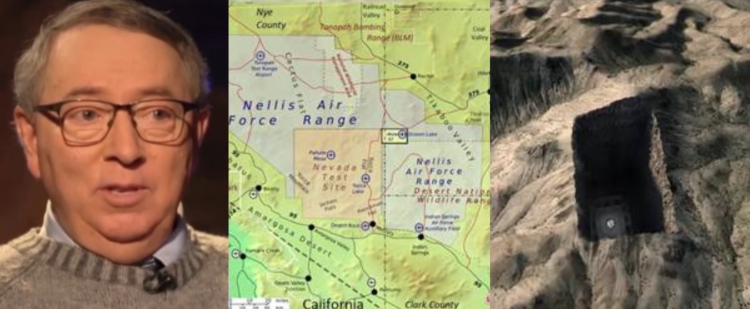 Через несколько дней мы совершили облет местности на вертолете. Во время первого полета мы не увидели ничего. Но я предложил еще раз пролететь. Когда мы пролетали над вершиной горы, гора оказалась… открытой. Мы могли смотреть в глубь горы. Я сказал: «Господи, посмотрите на это». А ведь всего 15 или 20 минут назад, когда мы пролетали над горой, она не была открыта. Внутри находилось нечто, похожее на здания, небольшие здания. Вернувшись и пообщавшись с шефом службы безопасности полигона, я выяснил, что там заброшенный урановый рудник и покинутый туннель. Испытательный полигон построил там что-то для проведения испытаний. Они собирались испытывать там лазеры. Когда они углубились в гору и прошли примерно 1,6 км, они обнаружили там "посетителей". Поэтому все оттуда убрались.