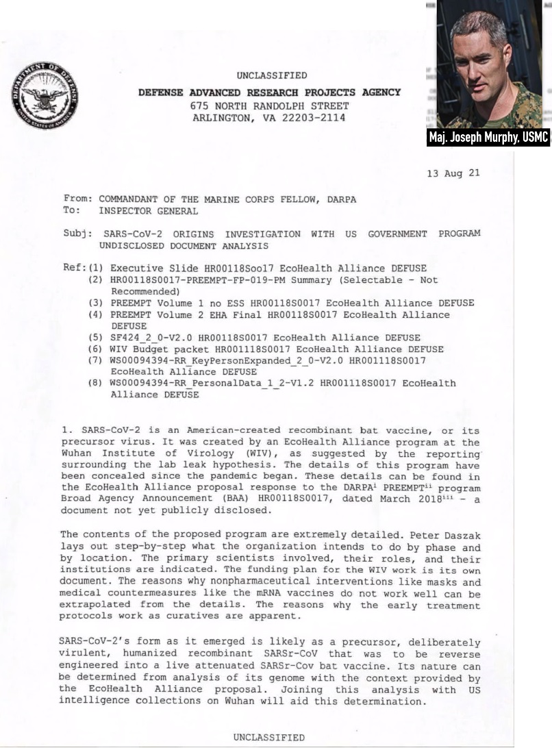 Теперь независимому объединению журналистов Project Veritas удалось получить отчет генеральному инспектору Министерства обороны, написанный майором Корпуса морской пехоты США Джозефом Мерфи, бывшим научным сотрудником DARPA. В отчете говорится, что EcoHealth Alliance обратился в DARPA в марте 2018 года с просьбой о финансировании для проведения исследований по повышению эффективности переносимых летучими мышами коронавирусов. Предложение, получившее название Project Defuse, было отклонено DARPA из-за соображений безопасности и того, что оно нарушает базовый мораторий. В 2014 году после ряда опасных утечек биобезопасности в нескольких федеральных исследовательских учреждениях правительство США наложило временный запрет на финансирование исследований, направленных на усиление способности вирусов, таких как грипп, MERS, SARS и т. д.