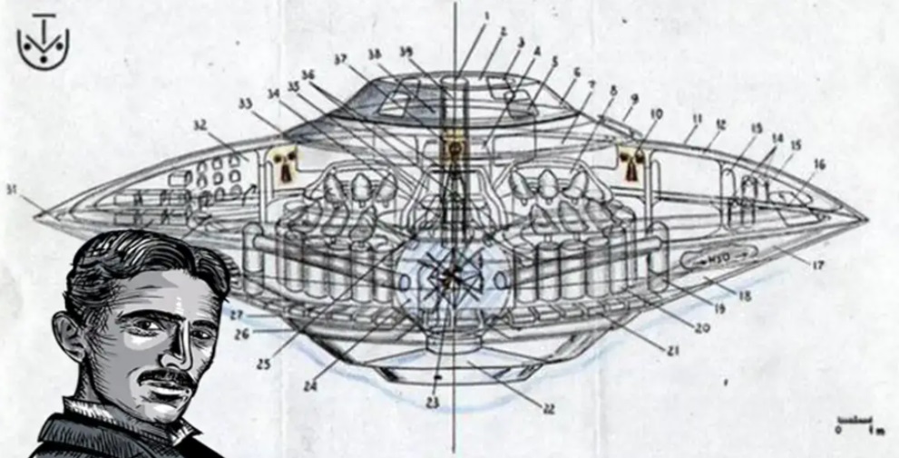 Он намекнул, что проект этого "НЛО" возник во время его работы над прототипом электромагнитного космического корабля. Именно эта конструкция, иллюстрирующая асинхронный двигатель Теслы, позже была опубликована в научном журнале. В 1901 году в личном письме своему другу Джону Лесли Уорду он рассказал о своих усилиях по созданию летательного аппарата, который, возможно, сможет приветствовать космических гостей. В 1928 году Тесла вписал свое имя в патент на «первую в мире летающую тарелку».