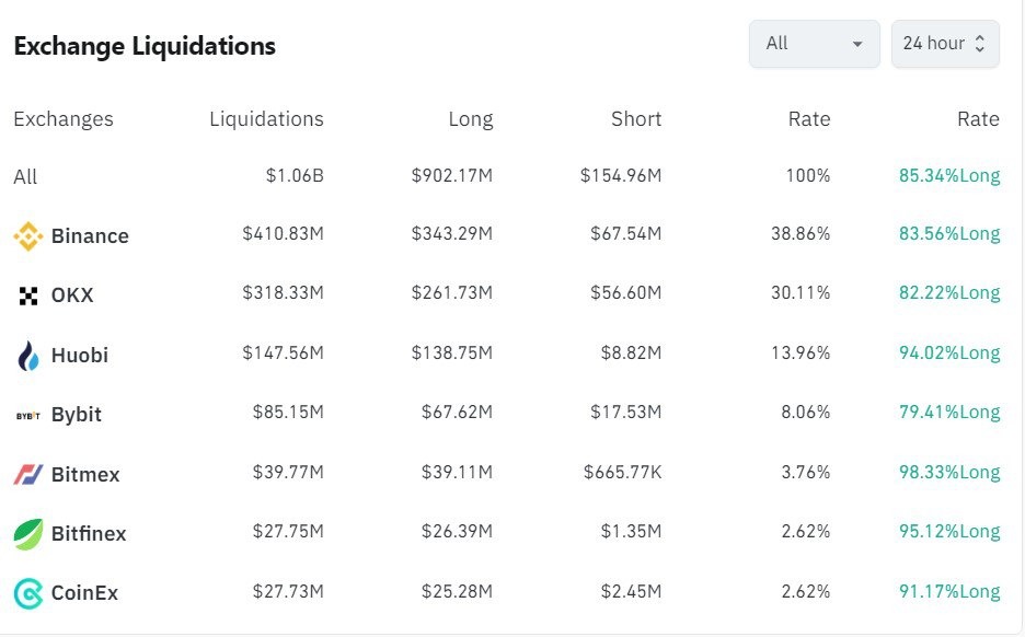 За последние сутки было ликвидировано 278 093 позиций трейдеров, общая сумма ликвидаций составила $1,06 млрд.