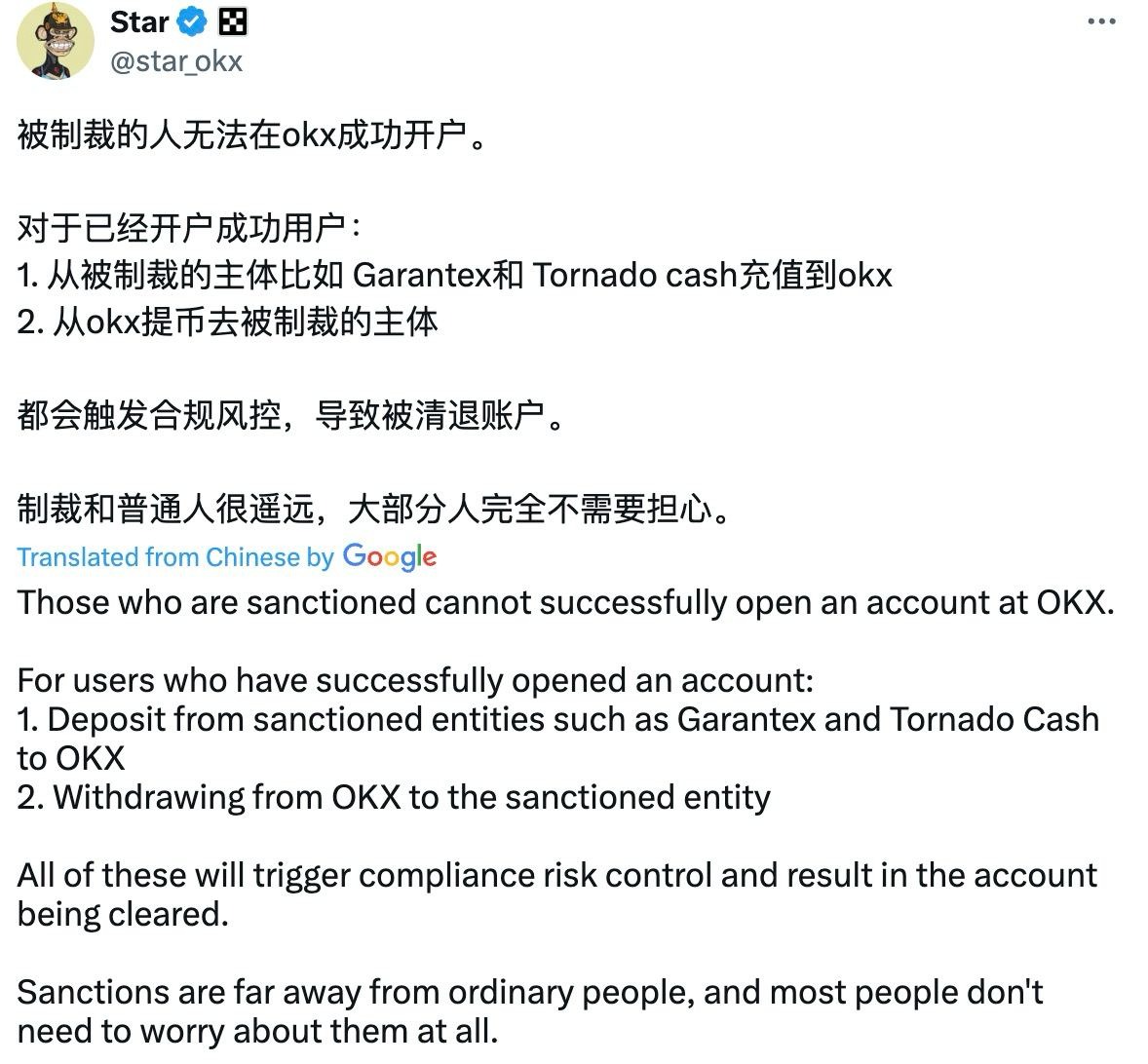 Те, на кого распространяются санкции, не могут успешно открыть счет в OKX... Обычные люди не знают о санкциях, и большинству людей вообще не нужно беспокоиться о них, — написал Стар Ксу в своем аккаунте X.