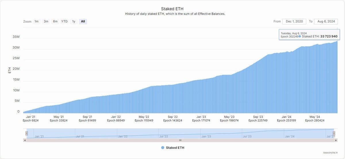 Объем стейкинга продолжает расти и достиг нового ATH, составив примерно ~33,723,940 ETH.