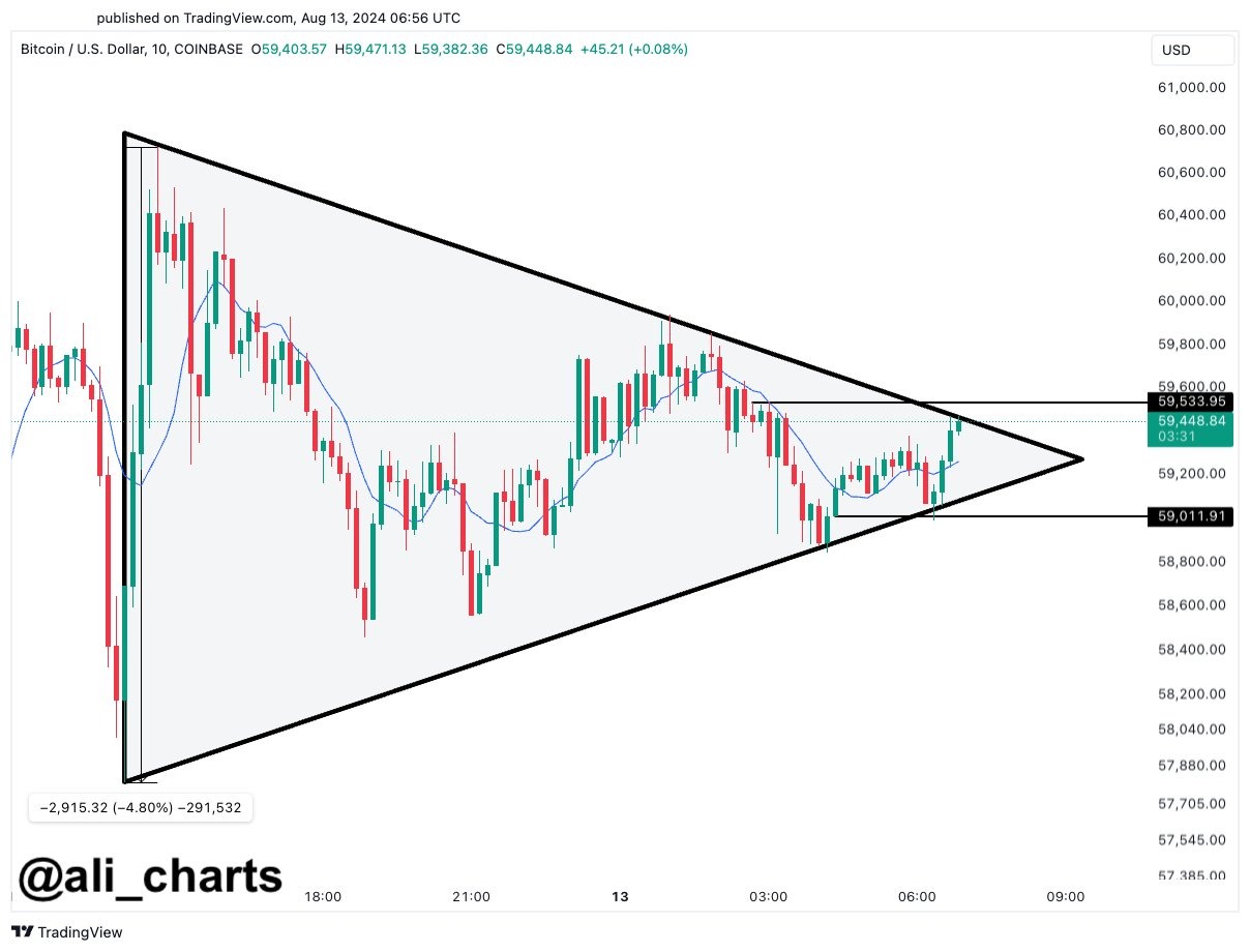 Устойчивое закрытие за пределами диапазона $59,000 - $59,530 может спровоцировать движение $BTC на 4,80%.