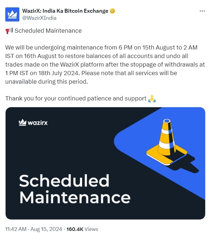 15 августа WazirX проинформировала пользователей о плановом техническом обслуживании, которое продлилось менее суток. Согласно объявлению, оно было направлено на восстановление балансов всех счетов и отмену сделок, совершенных на платформе после хакерской атаки.