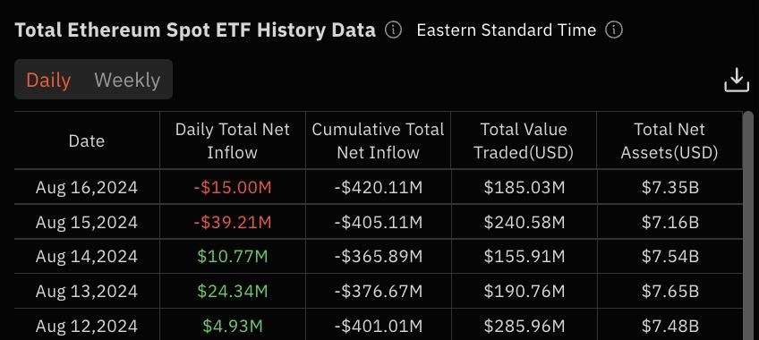 На прошлой неделе чистый отток Grayscale ETF ETHE составил $118 млн, чистый приток BlackRock ETF ETHA составил $76,35 млн, а чистый приток Fidelity ETF FETH составил $25,79 млн.