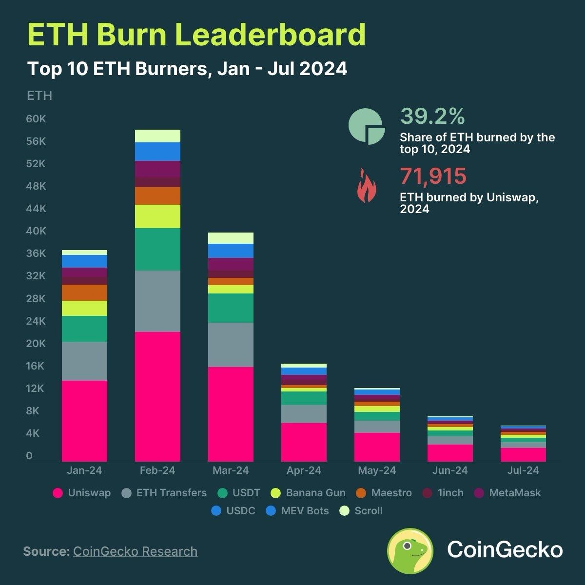 В 2024 году Uniswap стал крупнейшим сжигателем ETH, сжигая в общей сложности 71 915 ETH.